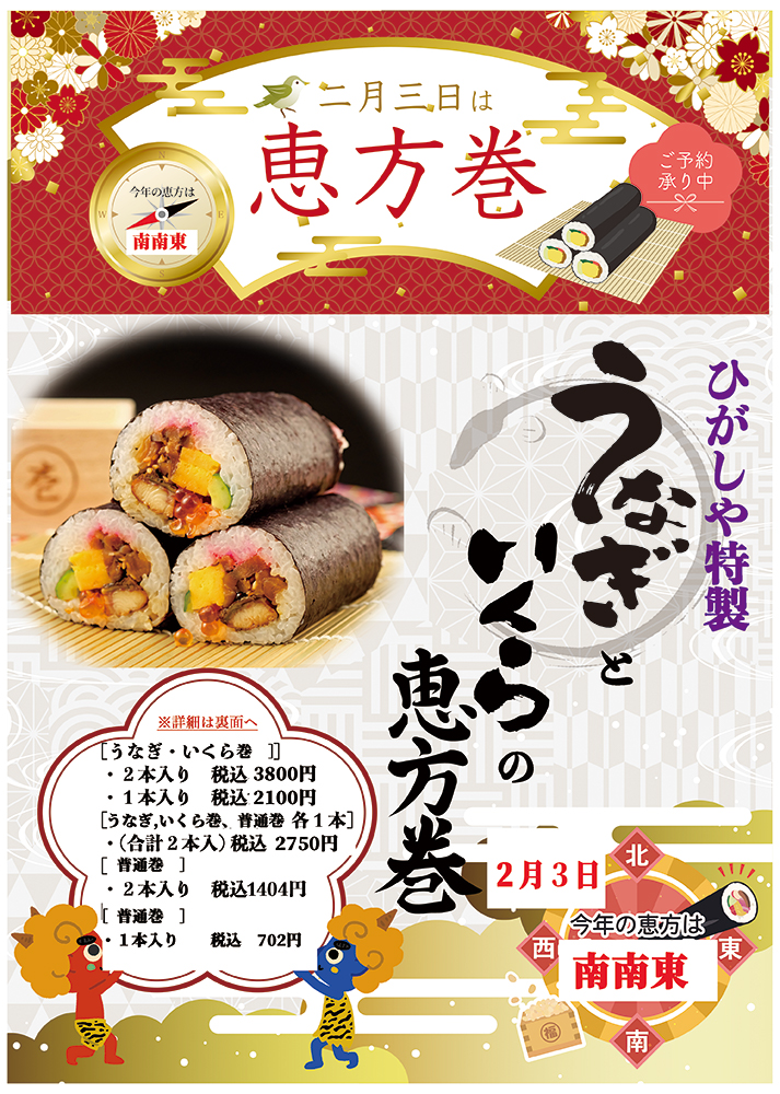 今年も2月3日(土) 節分のまるかぶり寿司『うなぎ・いくら恵方巻き』を販売いたします。